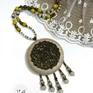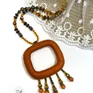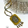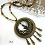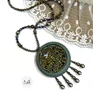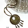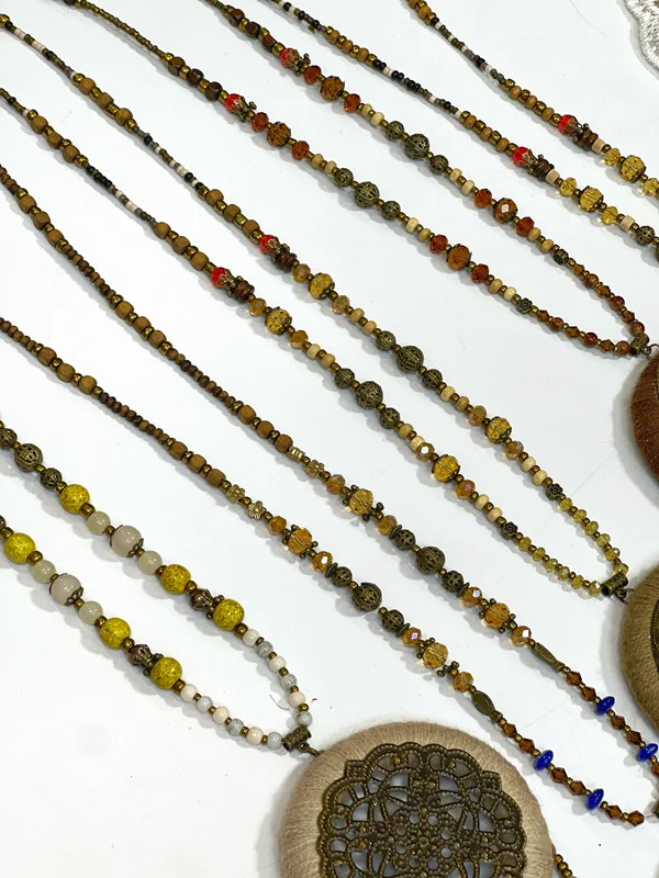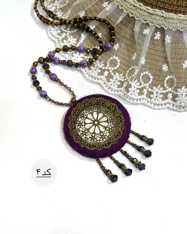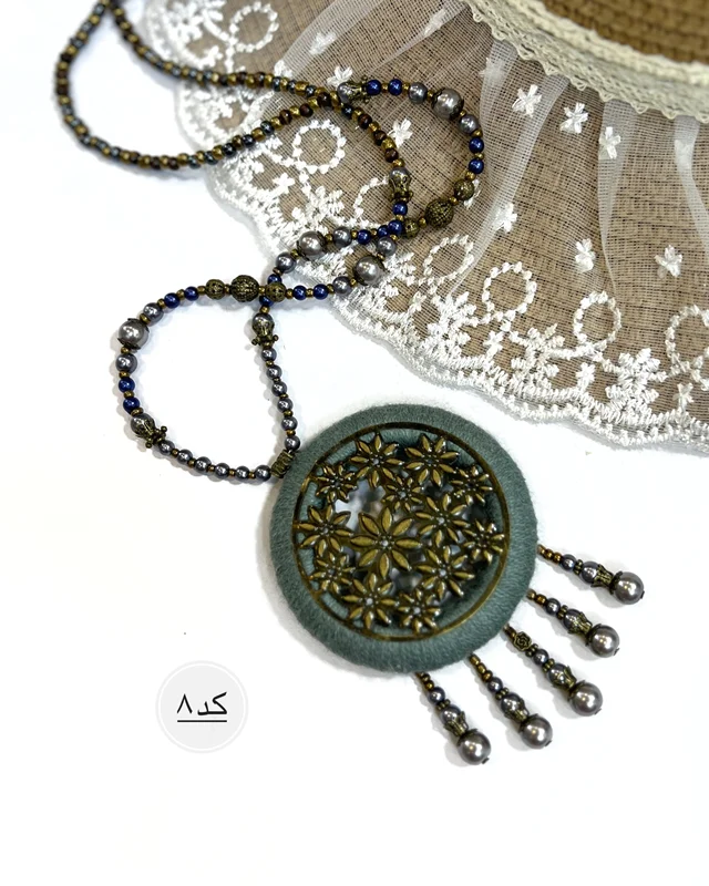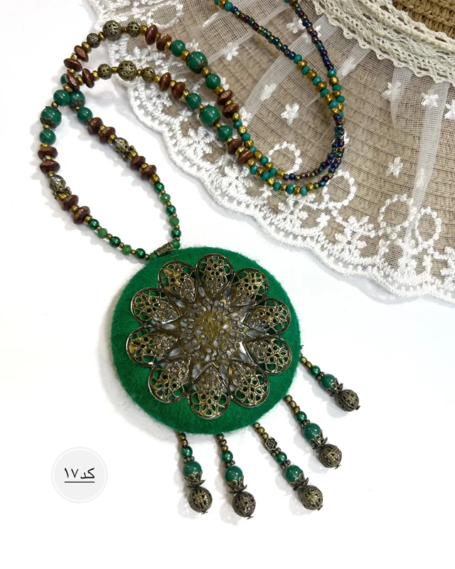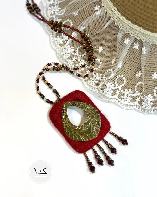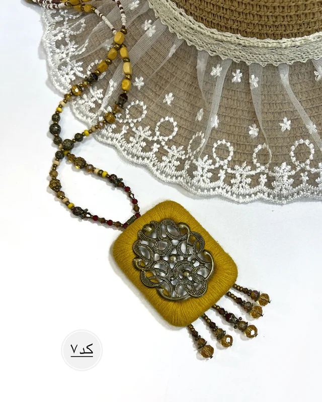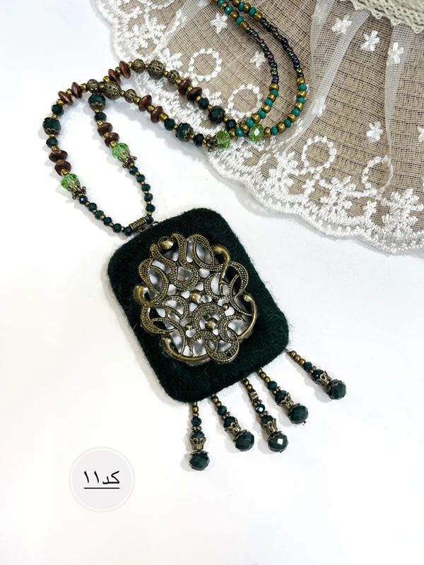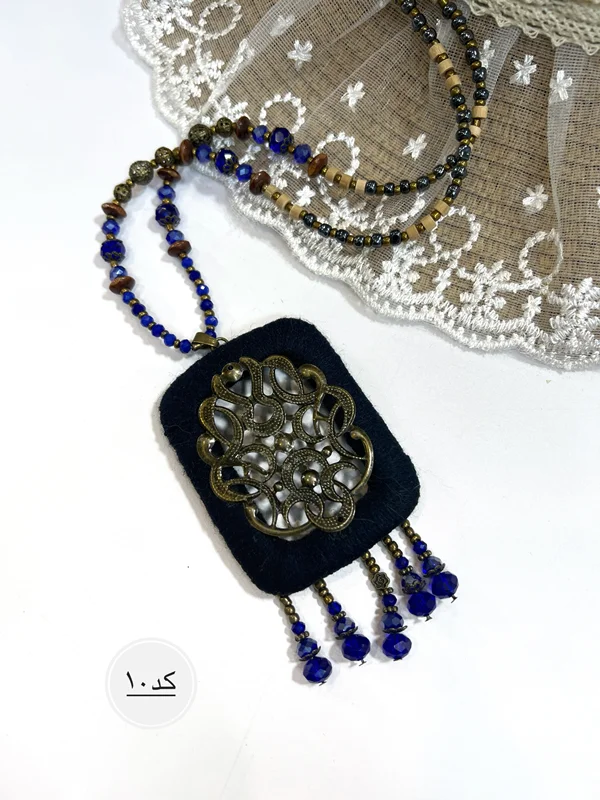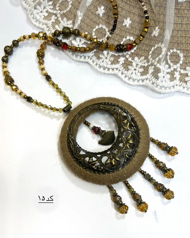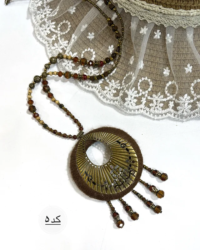 • مدال اصلی گردنبند با بافت تزئین شده و یک قطعه فلزی برنز رنگ ثابت با طراحی اسلیمی ظریف روی آن نصب شده است که جلوهای سنتی و اصیل به گردنبند میبخشد.• پنج آویز برنزی کوچک به همراه مهرههای کریستالی و برنزی از پایین مدال آویزان شدهاند. • بند گردنبند از ترکیب مهرههای کریستال، مهرههای چوبی و مهرههای برنزی حکاکیشده ساخته شده.